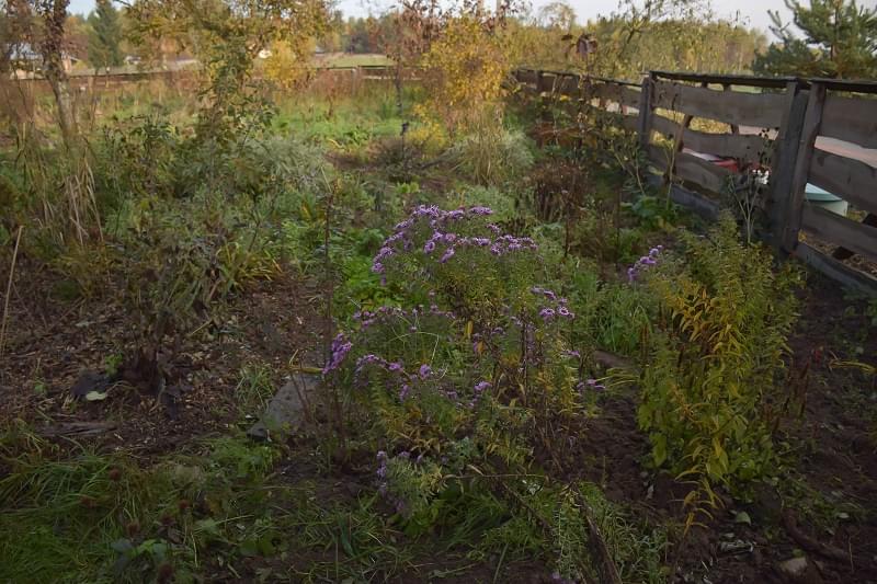 Natchnęło mnie, żeby jeszcze oczyścić fragment pomiędzy jabłonkami, na granicy angielskiej. W odchwaszczonych plackach ziemi były tam posadzone dwie róże: That's Jazz i jeszcze jedna, kilka liliowców i powojnik. Teraz bujnęły się tam pokrzywy i taka trawa tworząca duże kępy, które jednak dość łatwo się wyrywa. Przez pół godziny ryłam zajadle i odrzucając wyrwane zielsko na kupę. Ogarnęłam ten fragment pozostawiając tylko dwie czy trzy największe kępy trawska oraz odrost robinii, z którym nie mogłam sobie poradzić.