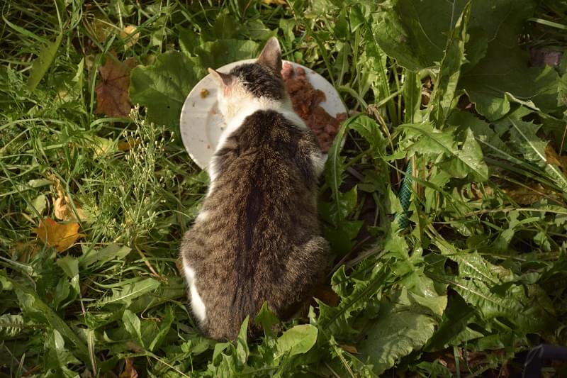 W pewnym momencie usłyszałam miauczenie. Trzy metry ode mnie siedziała miejscowa kicia i chcąc zwrócić moją uwagę pomiaukiwała w moją stronę. Poszłam do domu po puszkę kociego żarcia, kicia galopem za mną. Nakarmiłam potwora i usiadłam na ganku